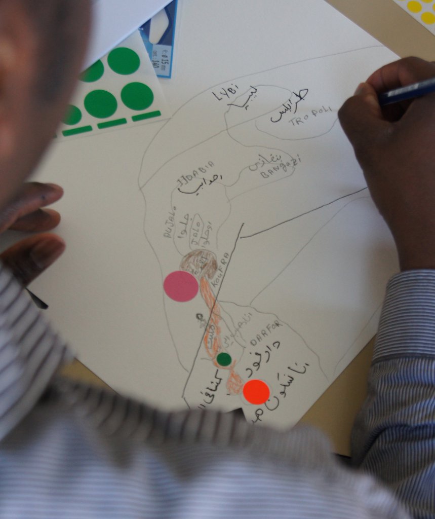 Modelées dans de l’argile, brodées sur des draps ou dessinées sur de grandes feuilles de papier, les cartes de l’installation donnent une (fausse) première impression de projet scolaire. Vues de près, elles résument des voyages-odyssées depuis le Soudan, le Congo, l’Érythrée, la Libye, la Syrie, l’Arménie, le Liban… Chaque carte est jalonnée de gommettes dont les formes et les couleurs sont un code signalant le danger, la police ou la mort, mais aussi la chance, l’amitié, le repos, les soins reçus…