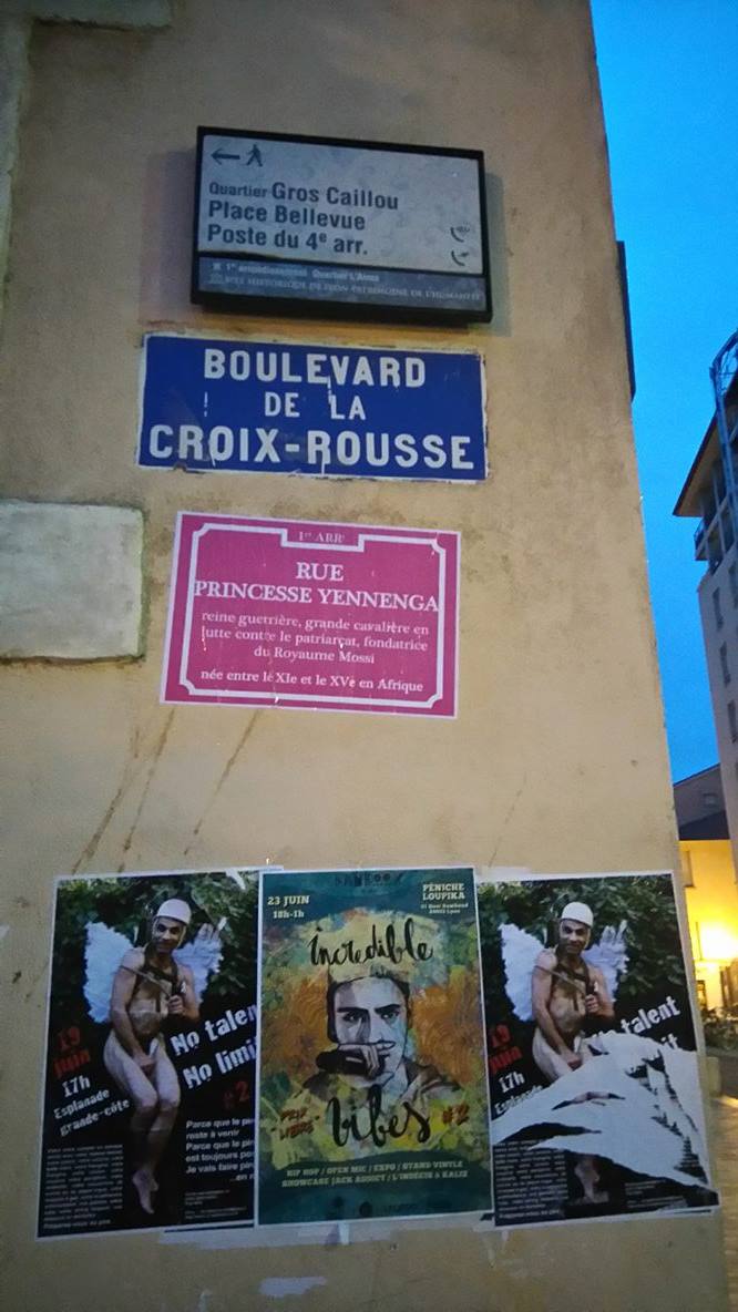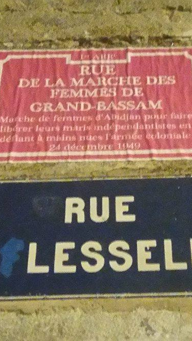 C’est le cas de la rappeuse nigériane Zara Moussa (“pionnière du hip-hop féminin d’Afrique de l’Ouest, porte-parole des sans-voix et des droits des femmes“) ou de la princesse légendaire Yennenga (“reine guerrière, grande cavalière en lutte contre le patriarcat, fondatrice du royaume Mossi, née entre le XIeme et le XVeme siècle en Afrique“). D’autres femmes en lutte font le lien entre le combat contre le sexisme et celui contre le colonialisme et l’impérialisme : elles sont honorées par la rue de la Marche des femmes de Grand-Bassam (“marche des femmes d’Abidjan pour faire libérer leurs maris indépendantistes en défiant à mains nues l’armée coloniale, 24 décembre 1949“).