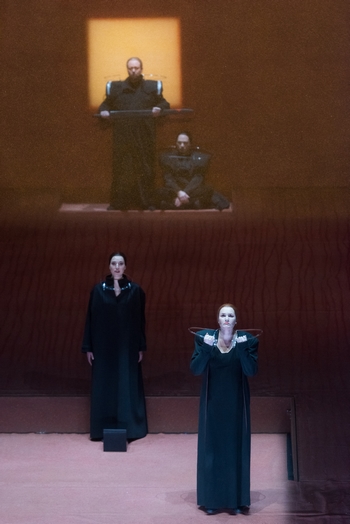 C’est donc une mise en scène sombre, même si certains jeux de lumière sont fabuleux (en particulier dans le deuxième acte) et suggèrent pudiquement l’intimité des deux amants.