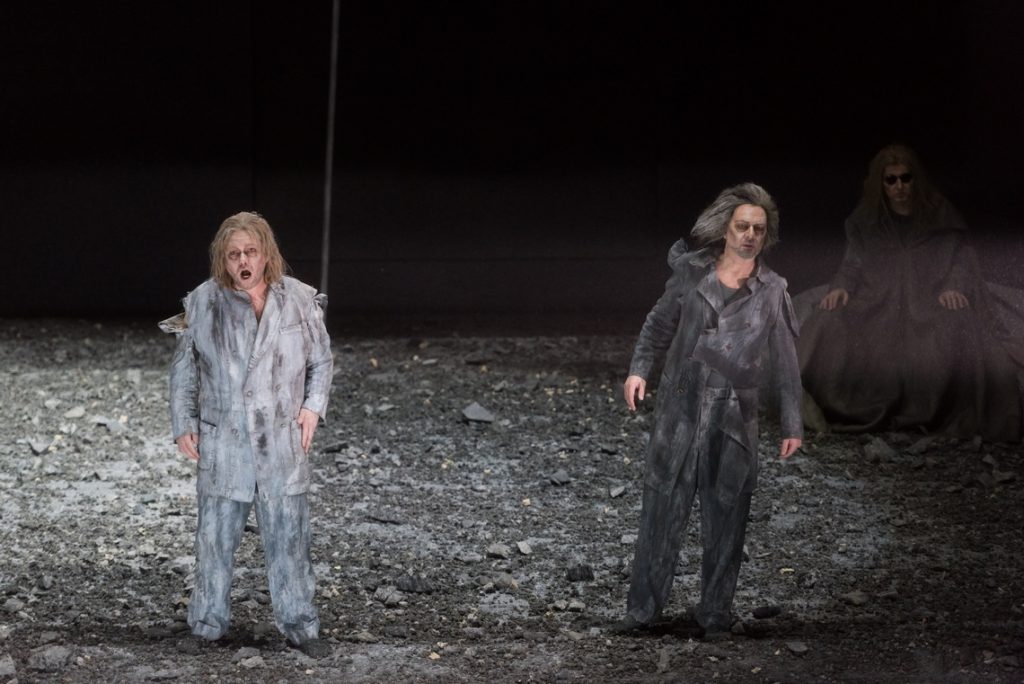 Le décor austère accentue cette impression de fatalité. Les protagonistes évoluent dans un cube et dans le premier acte, les duos Isolde/Brangäne et Tristan/Kurwenal sont même cloisonnés dans un espace limité dont la frontière symbolise la difficulté d’une rencontre. Dans le deuxième acte, celui de la passion amoureuse, Tristan et Isolde bénéficient d’un espace de liberté tout relatif. Le sol est jonché de plastrons qui délimitent des chemins labyrinthiques le long lesquels les amants vont se rapprocher ou s’éloigner, mais toujours selon des trajectoires prédéfinies. Au troisième acte, le décor intérieur du cube implose. Gravats, cendres et poussières accompagnent le destin tragique de Tristan, vêtu d’un haillon qui évoque, de loin, les tenues (et les représentations que l’on a) des détenu-e-s des camps de concentration.
